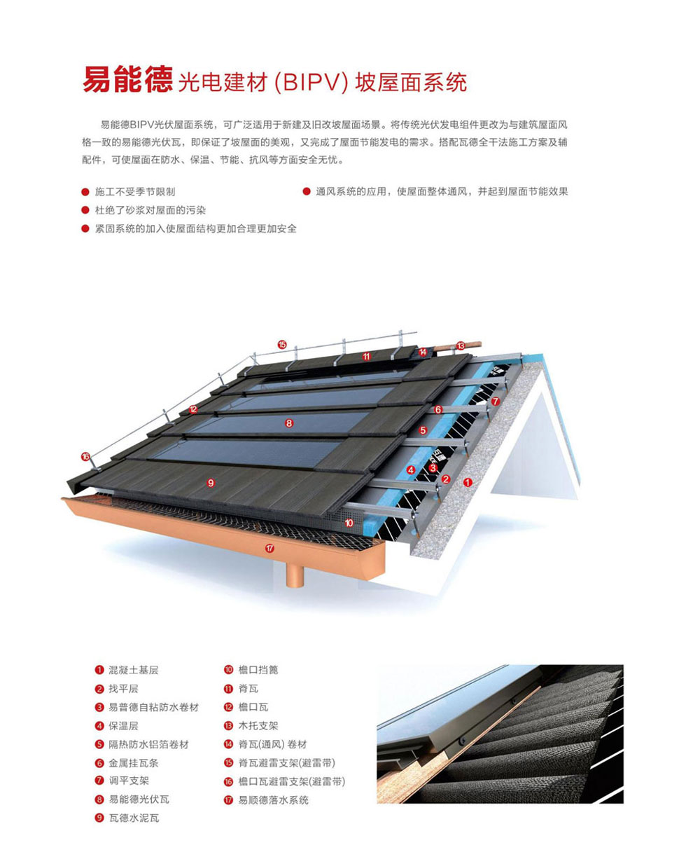 瓦德新材始終秉承著“雙碳經(jīng)濟綠色發(fā)展”的目標和理念。提出了“屋面系統(tǒng)一體化”的理論,以產(chǎn)品屬性為依據(jù)進行系統(tǒng)化設計,致力于實現(xiàn)“通風屋面”、“節(jié)能屋面”和“零碳屋面”的目標,受到廣泛認可和應用。并且,發(fā)揮自身的“產(chǎn)業(yè)優(yōu)勢、創(chuàng)新優(yōu)勢、品牌優(yōu)勢、市場優(yōu)勢”,與光伏產(chǎn)業(yè)的頭部企業(yè)合作,共同開發(fā)出易能德光伏與建筑一體化(BIPV)系列產(chǎn)品,以推動綠色節(jié)能建材行業(yè)的可持續(xù)發(fā)展。